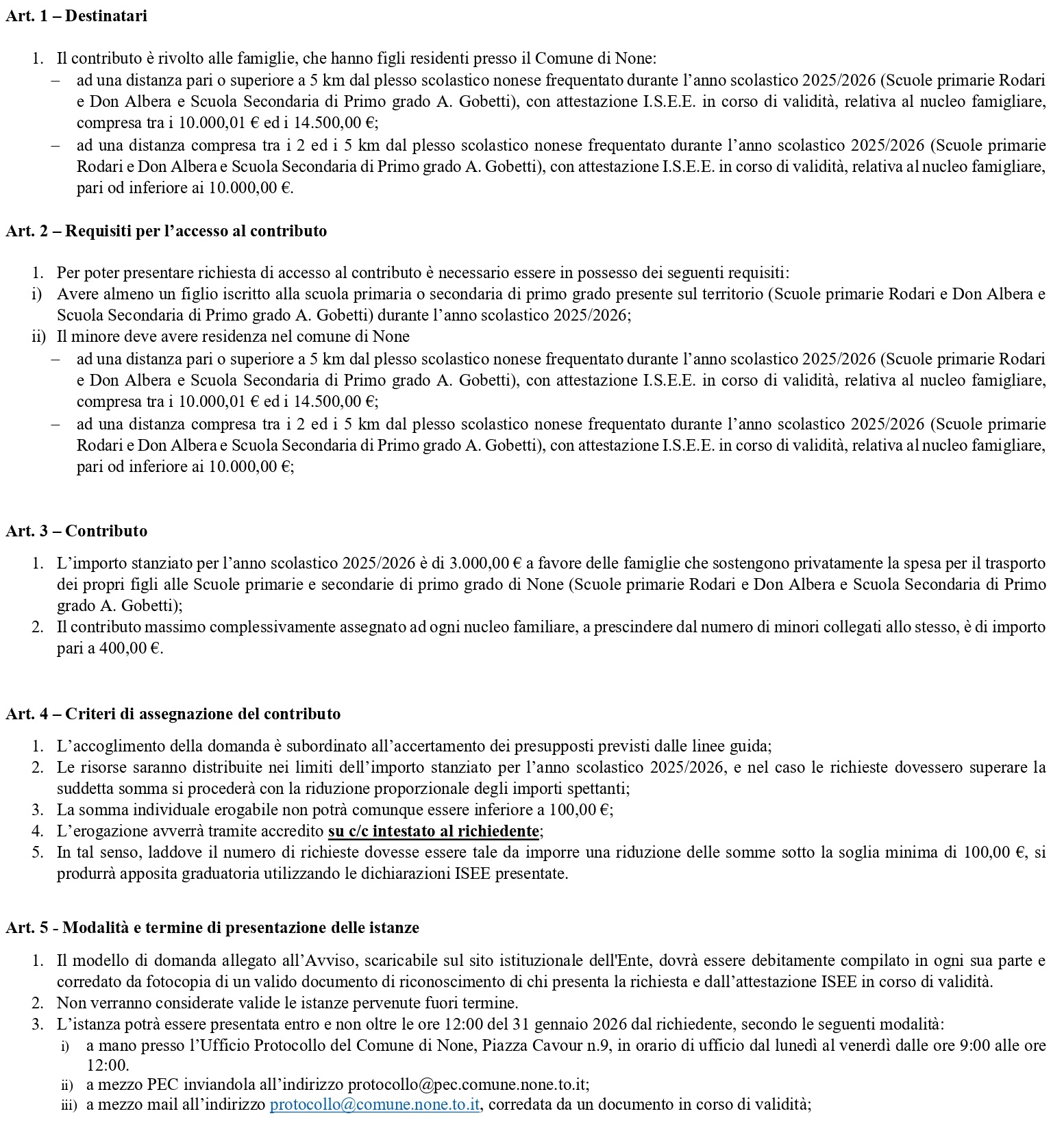 Le presenti linee guida disciplinano le modalità di accesso al contributo sostitutivo del soppresso Servizio di TRASPORTO SCOLASTICO per gli alunni frequentanti le Scuole dell'obbligo presenti sul territorio durante l’anno scolastico 2025/2026 (Scuole primarie Rodari e Don Albera e Scuola Secondaria di Primo grado A. Gobetti).